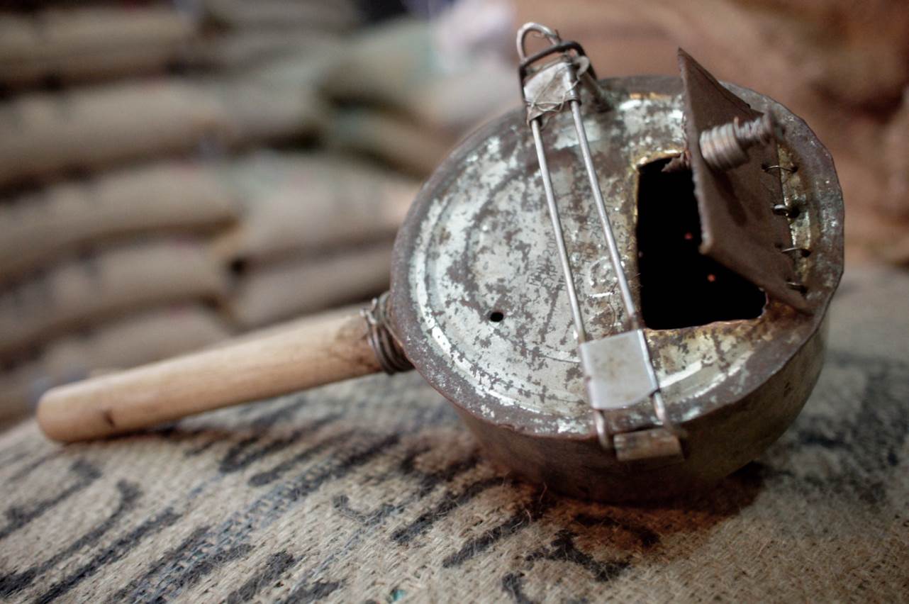 最早的烘豆機,不過也不能被稱作是機器,因為它是創辦人使用便當盒DIY出來的,自製手網,沒有電力只能以手搖的方式烘豆。手持烘豆機,必續在瓦斯爐上維持有規律地搖動,不能停止,直到烘到要的焙度。當然,手搖的方式的最困難的地方就是不能停下搖動。但這樣簡易的烘豆機也開啟了路易莎的風味旅程。