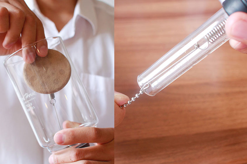 先將濾器浸入熱水五分鐘,待濾布沖分濕潤後,裝入上座,將掛鉤掛上玻璃管下緣。