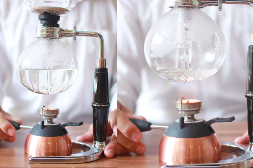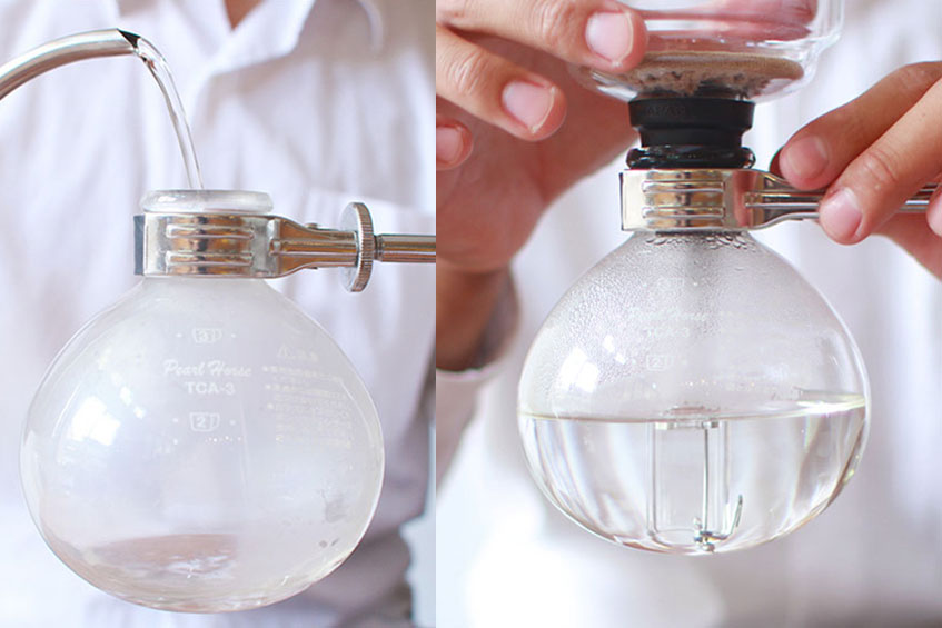 在玻璃下座中裝入熱水360 ml。(以21克粉為例) 將玻璃上座與下座結合,不需用力壓緊,只需確認有固定,且橡膠部分有均勻結合。點火開始加熱玻璃下座內的熱水。