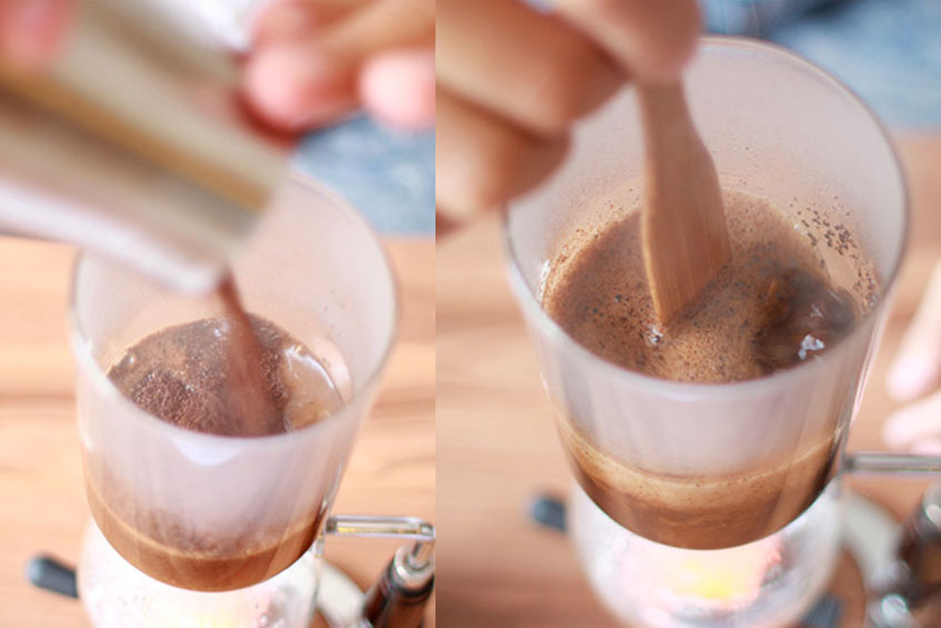 將咖啡粉均勻倒入上壺,用攪拌棒快速均勻攪拌三次。三十秒後,再攪拌兩次四十五秒後,移開熱源,同時快速均勻攪拌兩次。