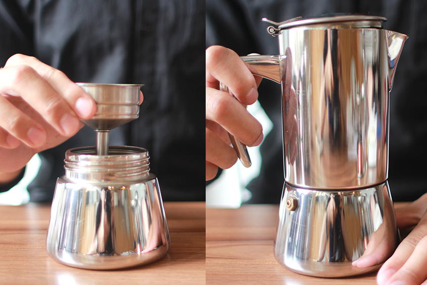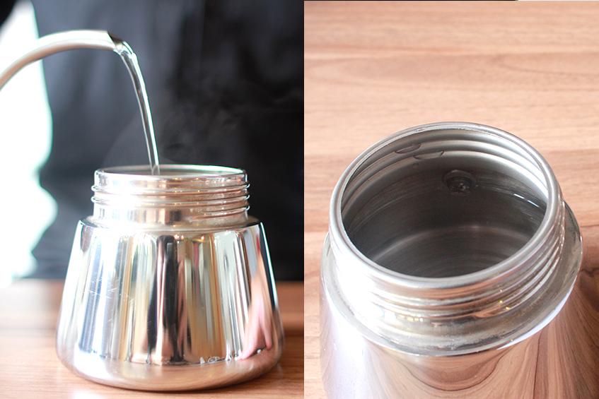 在摩卡壺下壺內加入水,水量不能超過氣閥口