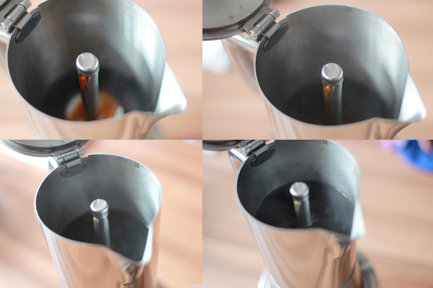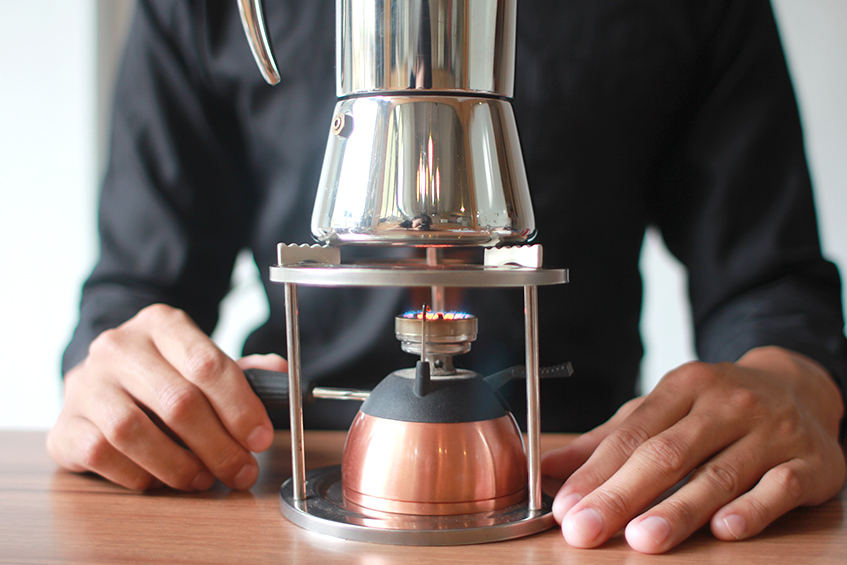 隨著壓力越來越大,下壺的水會漸漸通過咖啡粉到上壺,如果上升的咖啡液是噴射狀,表示火太大,必須將火調小。我們期待咖啡液是流暢的從下壺升上下壺