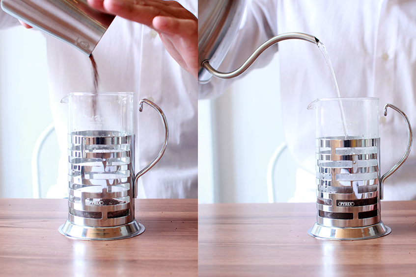 將咖啡粉加入法式濾壓壺內,再將一些熱水均勻倒入壺內(約1/3)並取木調棒均勻攪拌