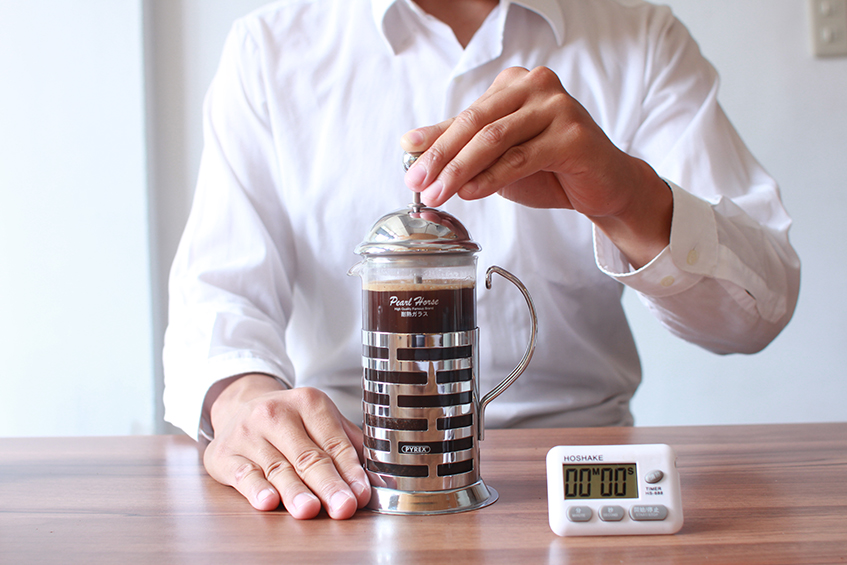 將剩下的熱水倒入壺中,並將蓋子蓋上,此時先不要壓,計時四分鐘