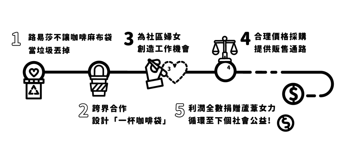(上圖) 咖啡麻布再運用企業公益合作案流程圖。《了解更多 蘆葦女力 請點擊前往FB粉專 》