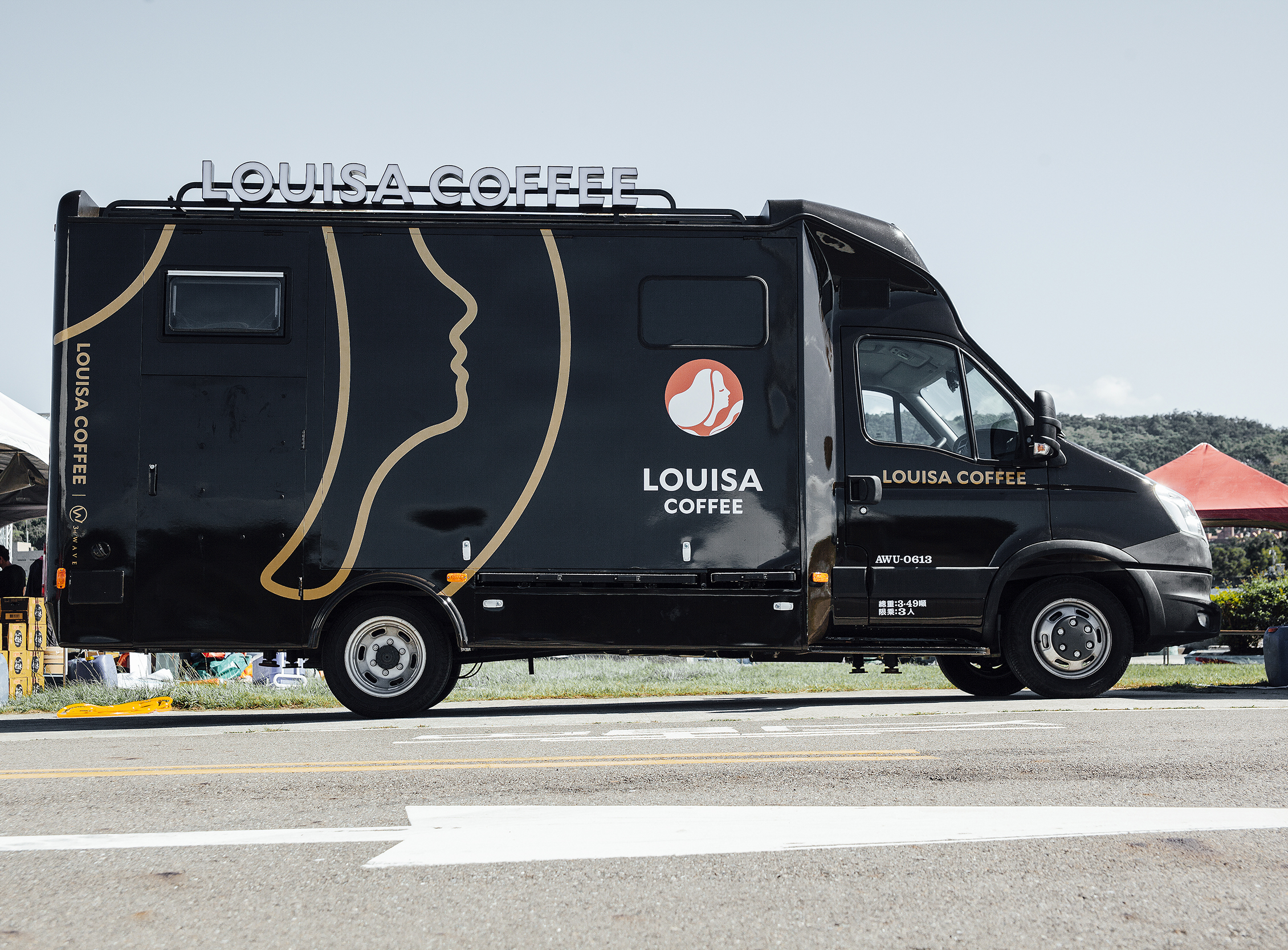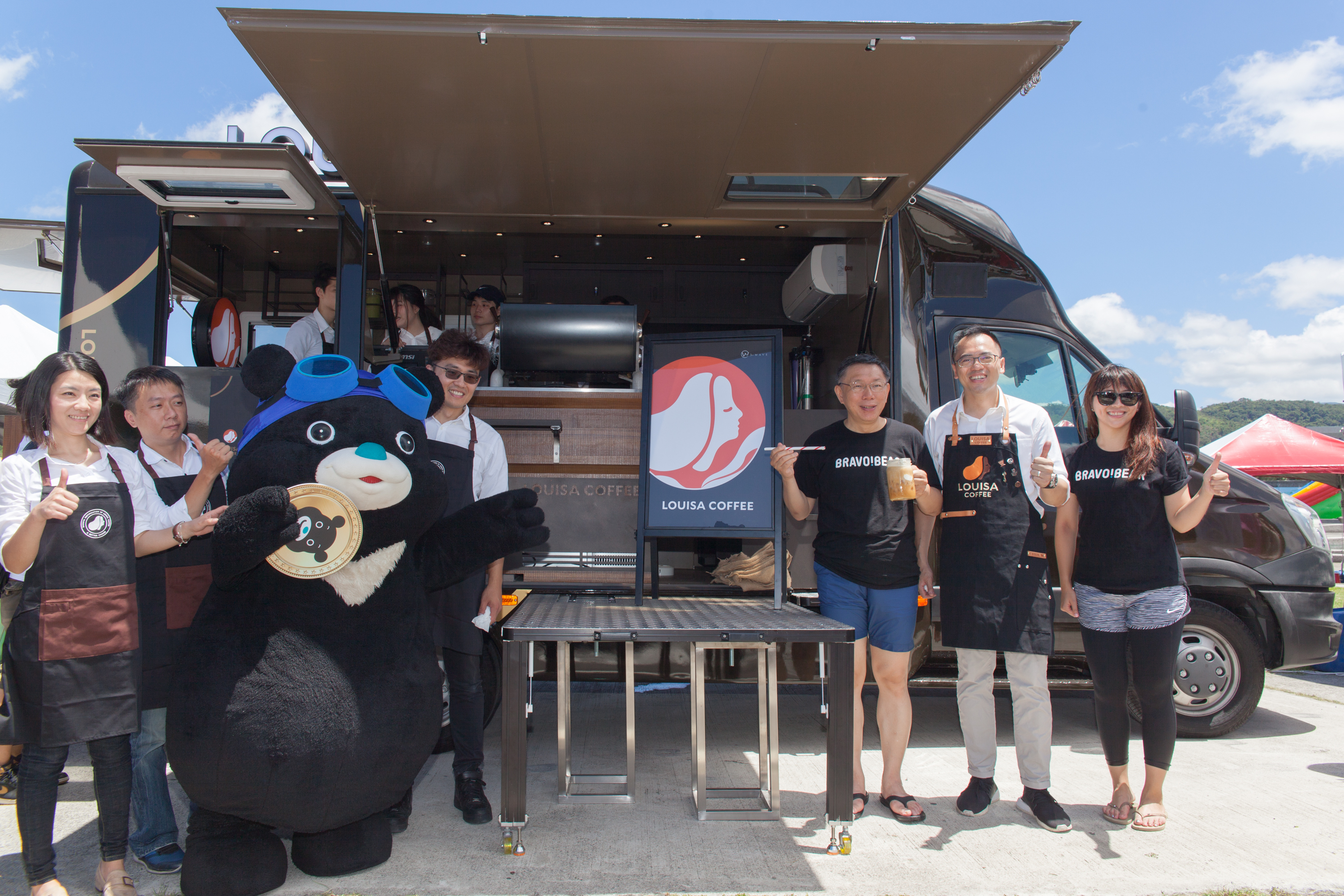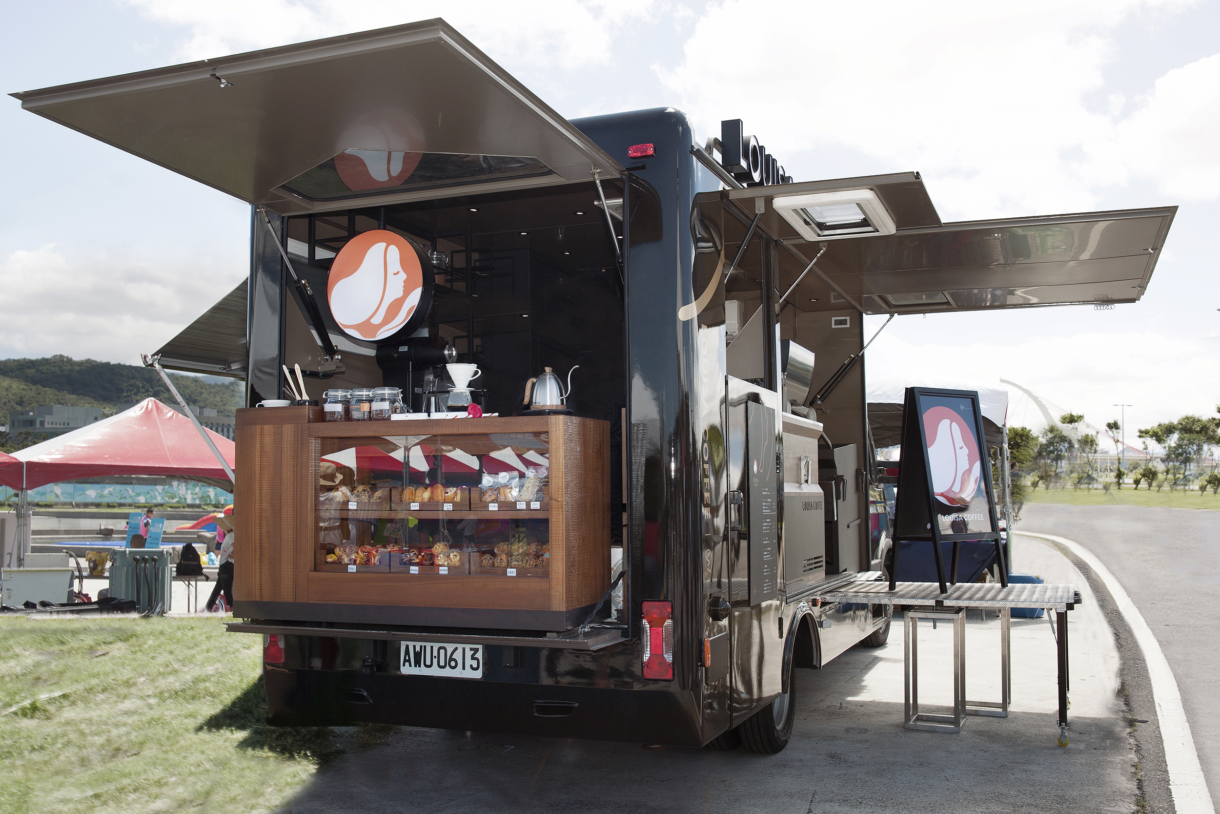 路易莎咖啡耗時一年斥資800萬打造全台第一的第三波精品咖啡行動門市,7/14在大佳河濱公園台北河岸同樂會正式亮相,現場台北市長柯文哲和熊讚也蒞臨現場同歡!義大利進口的車體展開長逾8公尺寬逾3公尺,展開就像隻遨遊天際的黑鷹,透過設計團隊的巧思、秉持「翻轉吧檯」概念,特別將咖啡車的靈魂「咖啡機」設置於外推高台上,讓民眾全視角觀看咖啡烹煮過程,除了義式咖啡外,車上也有手沖區、餐食等設備,開著咖啡車到日月潭、墾丁等台灣知名美景,體驗路易莎的精品咖啡文化。