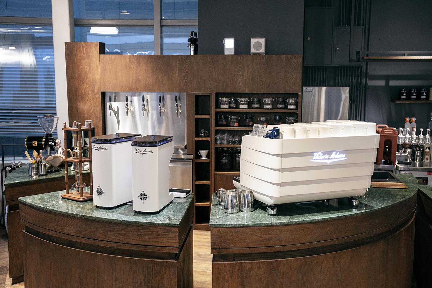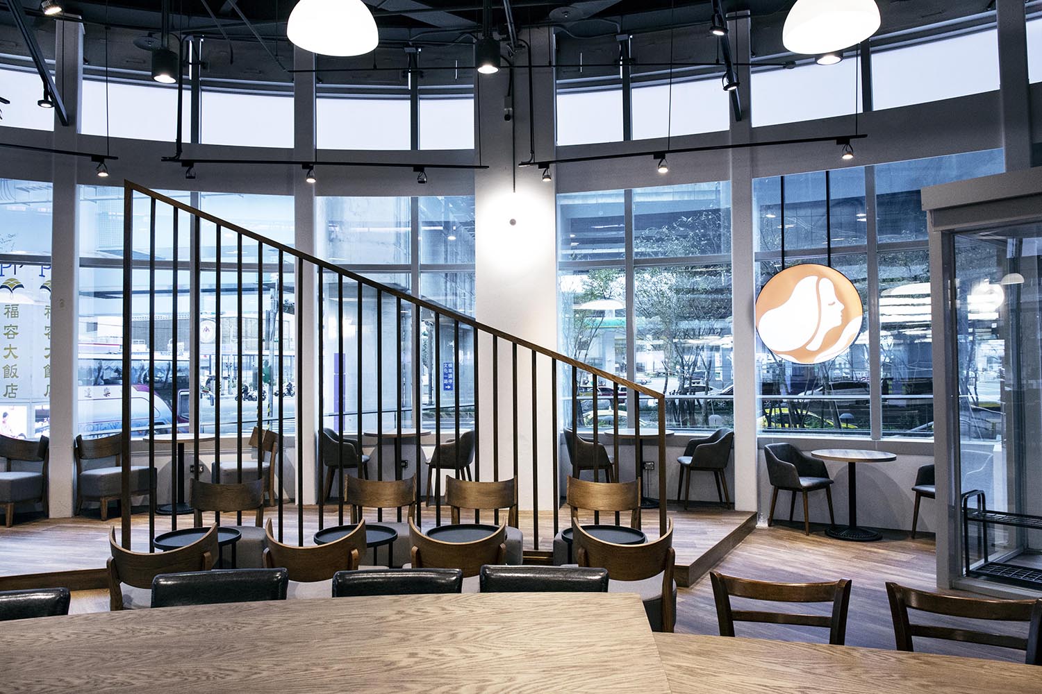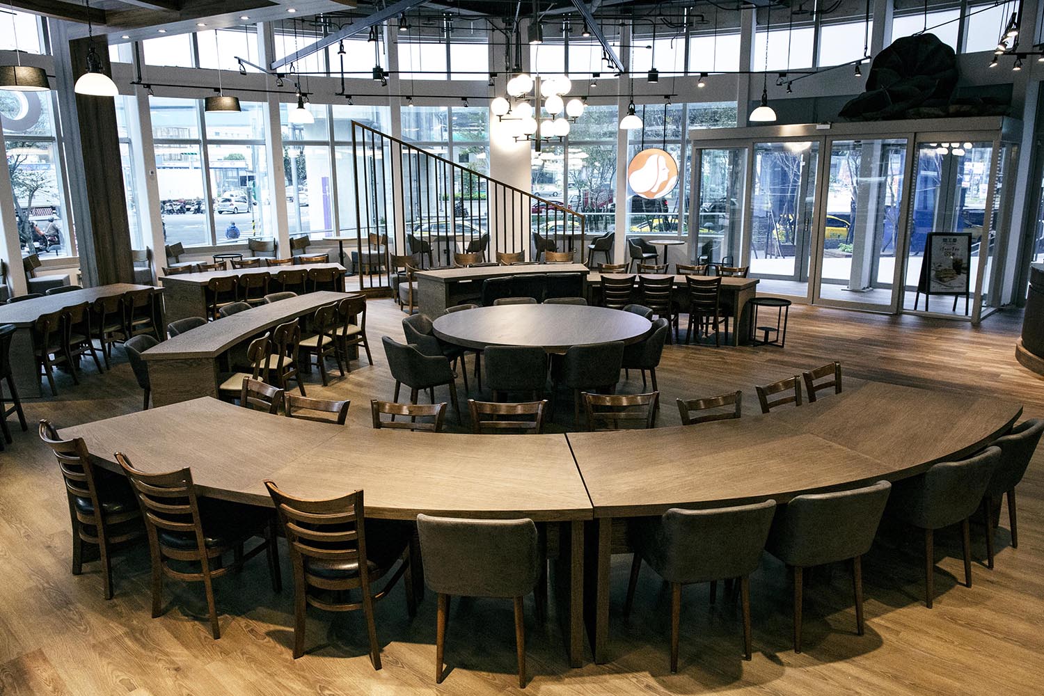 「咖啡風味輪 Flavor wheel」是用來輔助杯測師有系統地分析上千種咖啡風味的工具圖,同心圓擴散宛如萬花筒般,呈現咖啡風味的豐富性。環球A8門市設計回歸咖啡初心,將風味輪概念置入整體空間,以同心圓-扇形規劃座位,希望每位咖啡愛好者能在不同角落細細品嚐手中咖啡風味。